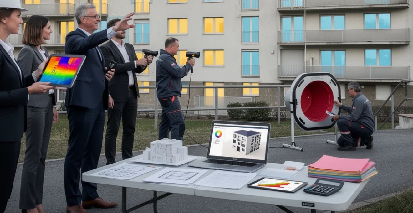 L’audit de performance globale s’appuie sur une méthodologie rigoureuse définie par la norme européenne NF EN 16247-1. Cette approche standardisée garantit la qualité et la comparabilité des évaluations techniques réalisées sur les immeubles collectifs. La méthodologie comprend quatre phases distinctes : la phase préparatoire avec collecte des données existantes, la phase d’investigation sur site avec mesures et analyses, la phase d’analyse des résultats et enfin la phase de restitution avec recommandations hiérarchisées.