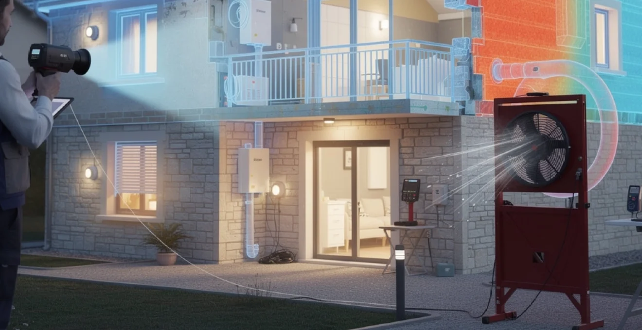 Le test d’infiltrométrie, réalisé à l’aide d’une porte soufflante (blower door), s’inscrit pleinement dans la démarche d’audit énergétique. Il consiste à installer un ventilateur motorisé sur l’ouverture d’une porte d’entrée ou d’un accès technique, puis à faire varier la pression à l’intérieur du logement. Pendant ce test, le thermicien mesure le débit d’air qui traverse l’enveloppe pour maintenir une différence de pression donnée (généralement 50 Pa).