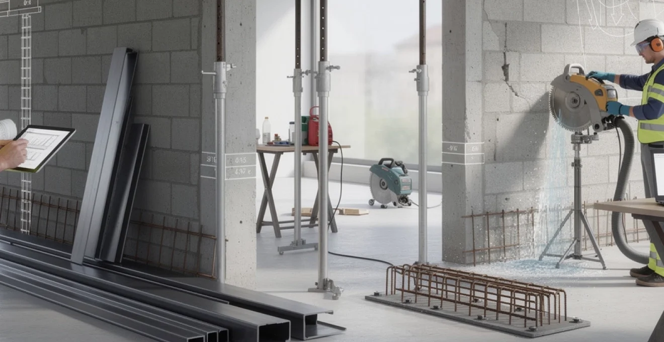 Après la découpe contrôlée et l’enlèvement de la portion de mur, la structure est provisoirement maintenue par l’étaiement. Il est alors temps de mettre en place le renforcement définitif : poutres IPN ou HEA, portiques métalliques, sommiers en béton, poteaux de soutènement. Cette étape transforme la configuration du bâtiment en lui offrant un nouveau chemin de charges pérenne, calculé pour durer toute la vie de l’ouvrage.